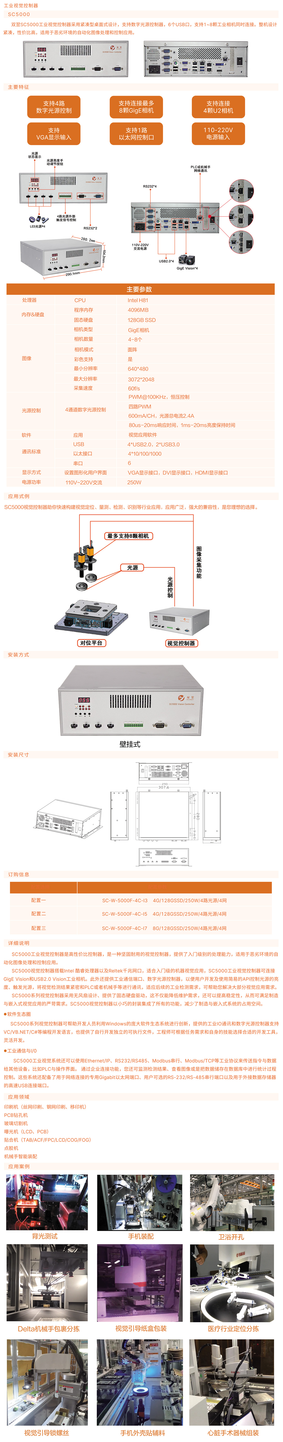 工业视觉控制器,SC5000工业视觉控制器采用紧凑型桌面式设计,支持数字光源控制器,6个USB口,支持1~8颗工业相机同时连接,整机设计紧凑,性价比高,适用于恶劣环境的自动化图像处理和控制应用。